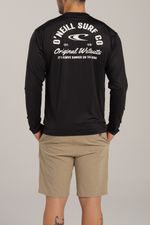 Esta camiseta manga larga negra de protección solar con estampado - O'Neill Surf Co - blanco en la parte trasera y estampado O´NEILL pequeño en la parte frontal le da un toque de estilo a tus días mientras te protege del sol.