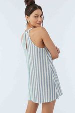 Este vestido de playa corto de O'Neill tiene un hermoso diseño tejido de lineas verticales en tonos azules, y un hermoso detalle de cuello alto con broche en la espalda para que luzcas hermosa sintiéndote cómoda a donde vayas.